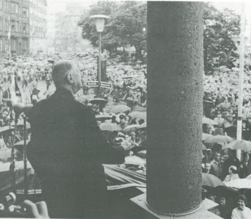 „Ihnen allen vielen Dank für den herzlichen und ergreifenden Empfang. Düsseldorf, diese schöne, fleissige, brüderliche Stadt, beweist nun, dass die Freundschaft genau das ist, was ihre Vernunft und ihre Gefühle betrifft. Es lebe Düsseldorf, es lebe Deutschland, die Freundschaft“, mit diesen Sätzen wandte sich de Gaulle an die Düsseldorfer Bevölkerung, die etwas eingeengt zusammen rücken musste, da die Staatskanzlei Wohn- und Bürogebäude umgaben.