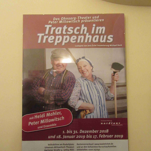 Unsere großen Kinder waren im Alter unserer Tochter, als wir das letzte Mal im alten Millowitsch-Theater waren, und das war locker zehn Jahre her. Damals war Peter Millowitsch noch der Inhaber des Theaters gewesen, das seit dem Jahr 1936 bestanden hatte. Inzwischen hatte sich das Millowitsch-Theater in „Volksbühne am Rudolfplatz“ umbenannt, nachdem Peter Millowitsch als Produzent und Regisseur aus Altersgründen ausgeschieden war. Nun kehrte er mit dem Theaterstück „Tratsch im Treppenhaus“ an seine alte Wirkungsstätte zurück. Das hatte uns aufhorchen lassen, und unsere gute Freundin hatten wir im Dezember letzten Jahres zu ihrem Geburtstag mit zwei Theaterkarten beschenkt.